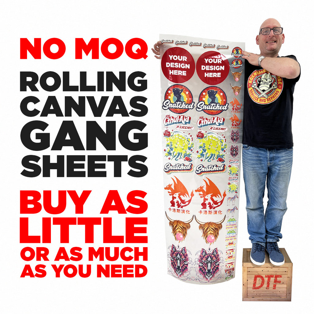 Our DTF prints are manufactured on industrial wide format printers, which can print 58cm wide and up to 200m long …and best of all there is no fixed gang sheet size or minimum order quantity.